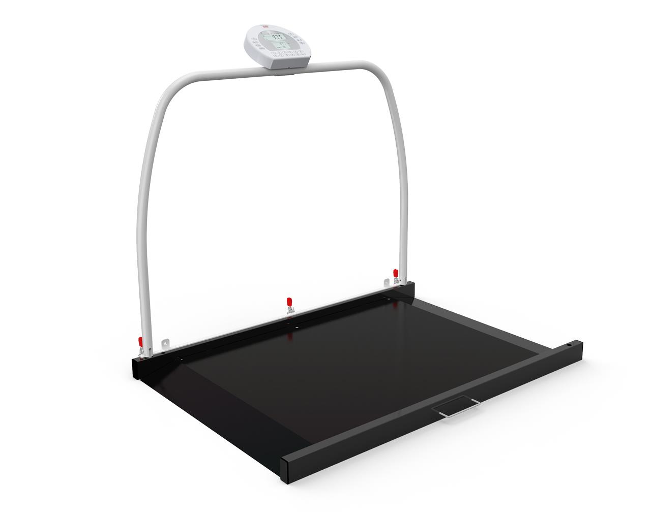 Bilancia pesacarrozzine digitale con piattaforma larga e facilmente accessibile grazie alla doppia rampa salita/discesa, ideale per la pesatura di pazienti in carrozzina. Dotata di corrimano e doppio display in ABS con tripla lettura simultanea: peso, altezza, BMI (Indice Massa Corporea).