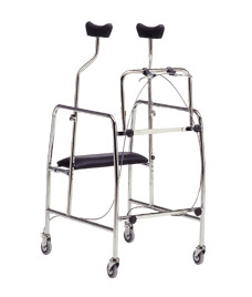 Deambulatore in acciaio cromato con quattro ruote di cui due piroettanti e due direzionali con freni. Completo di appoggi sottoascellari regolabili in altezza da cm 115 a 144. Comodo seggiolino imbottito.