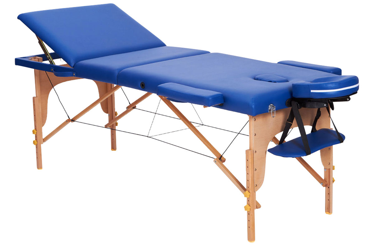 Lettino a tre sezioni in legno di faggio tedesco, pieghevole e regolabile in altezza.