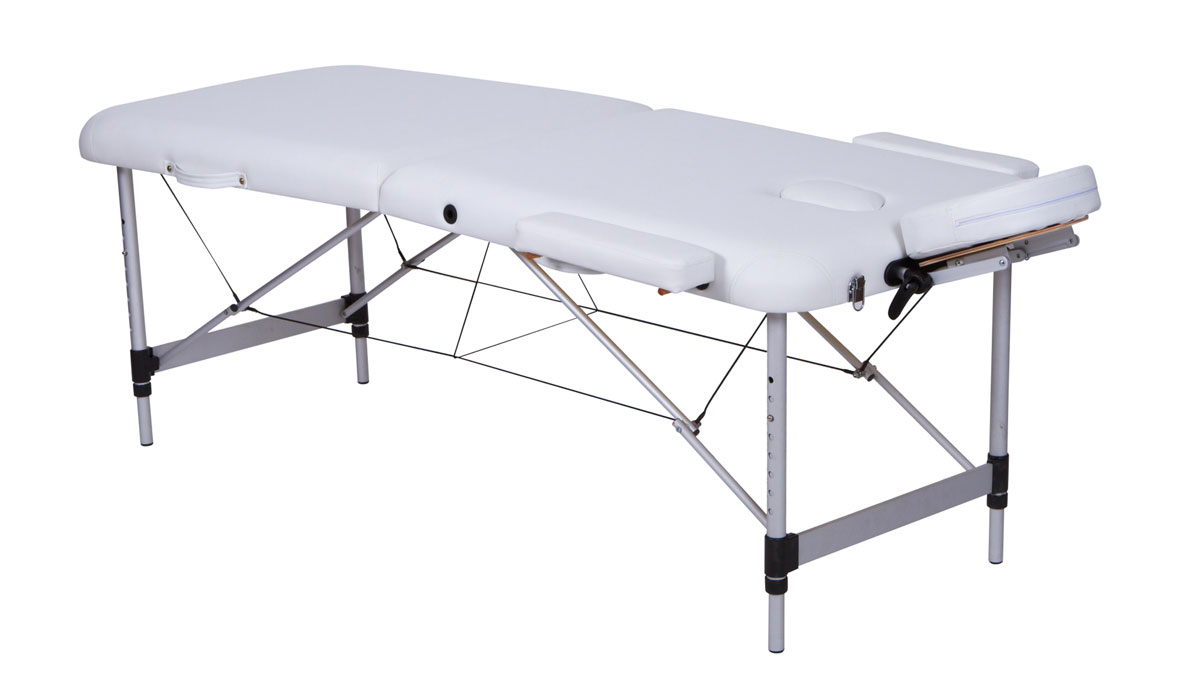 Lettino a due sezioni in alluminio, pieghevole e regolabile in altezza.