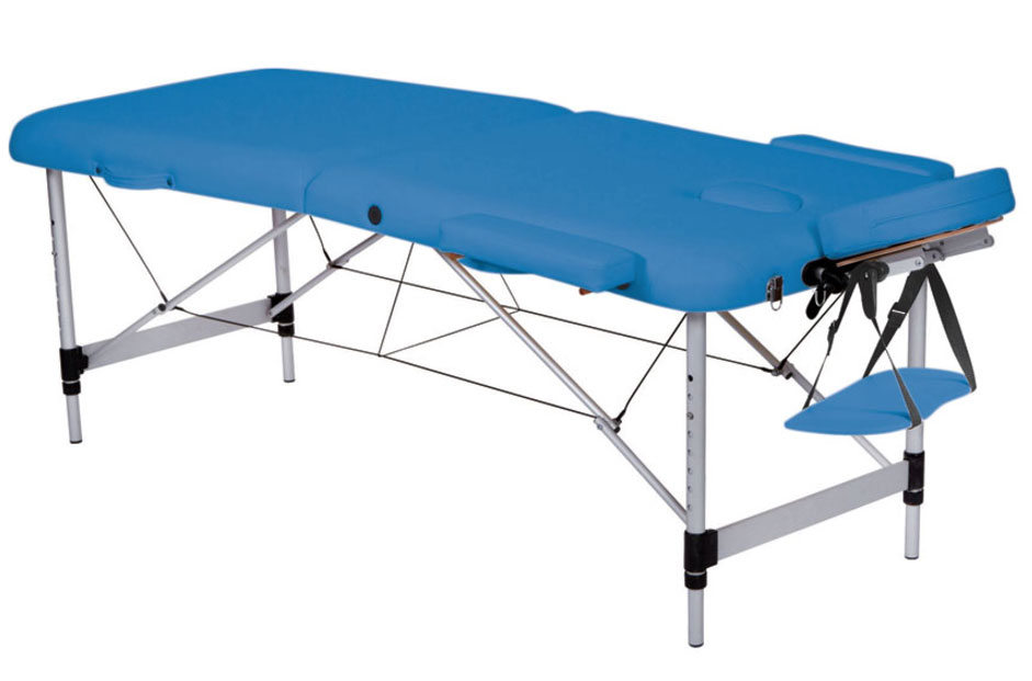 Lettino a due sezioni in alluminio, pieghevole e regolabile in altezza.
