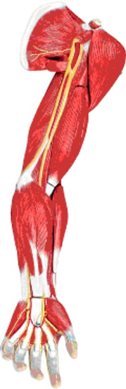 Questo modellino a grandezza naturale in sette parti illustra nei minimi dettagli, le strutture anatomiche del braccio, complete di muscolatura superficiale e profonda, strutture vascolari, nervi e legamenti. La mano e la spalla sono rappresentate con grande accuratezza.
