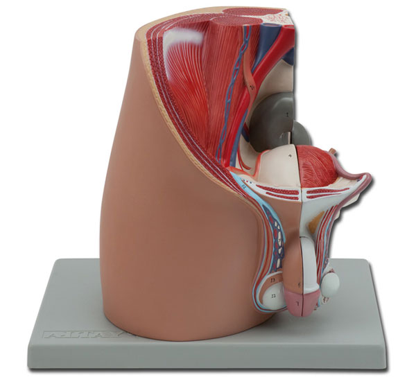 Modellino anatomico di dimensioni reali rappresentante l'apparato genitale maschile, in quattro parti. Presenta un'apertura all'altezza della sezione mediana sagittale del bacino. Le strutture interne del sistema urogenitale maschile sono rappresentate con un livello di dettaglio estremamente elevato.