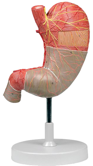 Stomaco, 1,5 x dimensioni reali. Questo modellino anatomico è sezionato lungo il piano mediale e può essere aperto per mostrare le strutture interne dello stomaco.