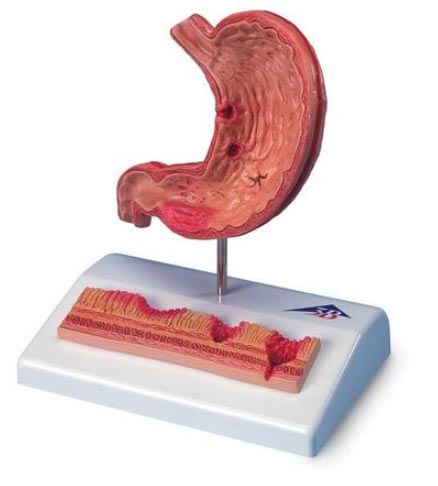 Modello su base di stomaco con ulcere gastriche che mostra i diversi stadi della gastrite: dall’ulcera leggera fino alla perforazione.