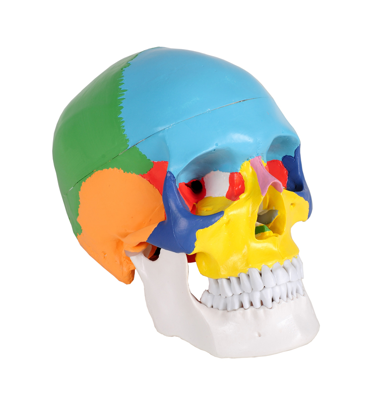 Una riproduzione fedele a grandezza naturale di un cranio umano con tutti i dettagli strutturali. La mandibola è articolata, la calotta cranica è estraibile per mostrare i particolari interni.