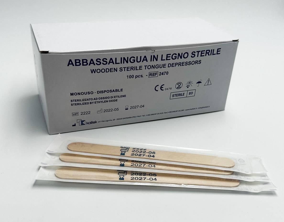 Abbassalingua monouso sterili da esame in legno di betulla. Uso ambulatoriale.